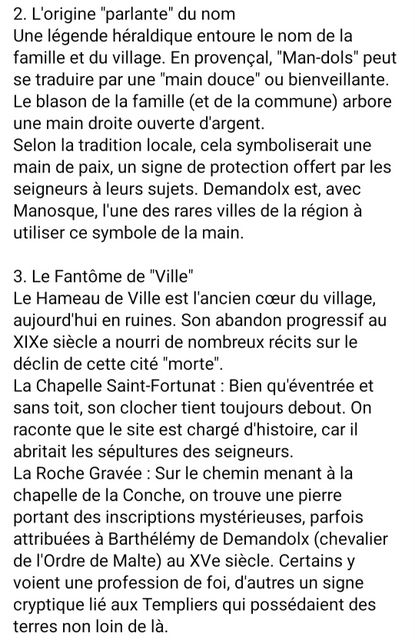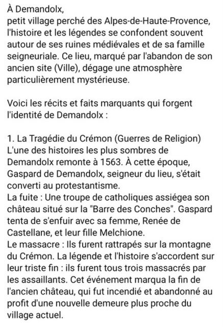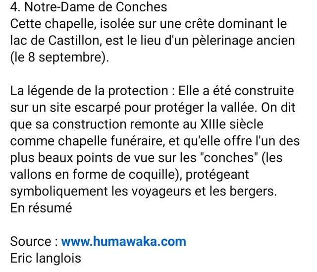 " ... Patrimoine religieux, * L’église Notre-Dame de Conches (*) ou Couenches est située au-dessus du lac de Castillon. Son site offre un superbe panorama. Elle a probablement été construite au xiiie siècle comme chapelle funéraire. * La chapelle Saint-Fortunat ou Saint-Pierre (*) date du XI° selon Raymond Collier, seulement du XIV° selon la DRAC. Selon l’Atlas historique de la Provence, le chœur est du XII°, le reste du bâtiment postérieur. Le bas-côté nord est voûté d’arêtes et probablement construit plus tard. Tout le bâtiment est dépouillé et voûté en berceau. L’église est voûtée entre le XIV° et 1610, puis allongée en 1610. La chapelle sud, qui servait à ensevelir les seigneurs de Demandolx, est reconstruite au milieu du XVII°. Cette chapelle s’est effondrée. Le clocher-mur est placé au-dessus du portail occidental. Elle est encore accostée de deux chapelles sur le mur Nord. Les arcs en lunule (plus large et épais à la base qu’au sommet) sont un indice de l’influence lombarde, ou de la participation de maçons venus du Nord de l’Italie...".