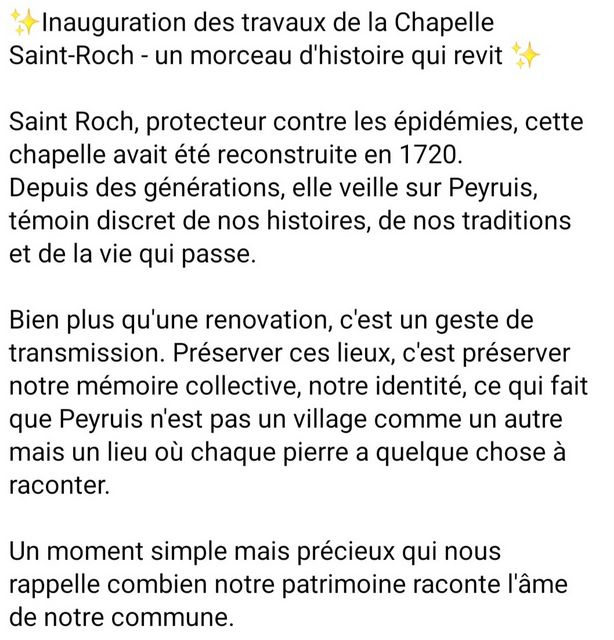 la chapelle dite de St Roch, située au quartier du même nom, à l’extrémité du village, sol approximativement de 100 m². Elle ne comprend qu’une seule nef entièrement nue avec deux ouvertures. Un autel en bois. Chapelle contigue au cimetière et affectée aux cérémonies des enterrements. Elle a été construite après 1720 par souscription publique et appartenait lors à la confrérie des pénitents blancs. Elle a été déclarée propriété nationale par la Révolution et vendue le 27 septembre 1793. Après le rétablissement du culte, la commune de Peyruis a acquis cette chapelle . Le coutumier de 1835 relate les fêtes patronales : Les fêtes patronales de la paroisse sont celles de st Roch et de st Nicolas. Le jour de la sollenité de St Roch, on part en procession de la paroisse et on se rend à la chapelle dédiée à ce saint. Arrivés à la chapelle on y célèbre la messe paroissiale, on donne à baiser le bras du saint. Après la messe, on revient en procession à la paroisse, on porte les bustes de St Roch et St Nicolas, celui de St Roch a le pas d’honneur le jour de sa fête. Le jour de la fête de St Nicolas, on fait la procession avant la messe dans l’enceinte du village. L’année 1720 vit le fléau de la peste débarquer à Marseille et se répandre dans toute la Provence où il y eut 50 000 victimes. C’est à cette occasion que fut élevé le mur de la peste ainsi que des chapelles protectrices . |