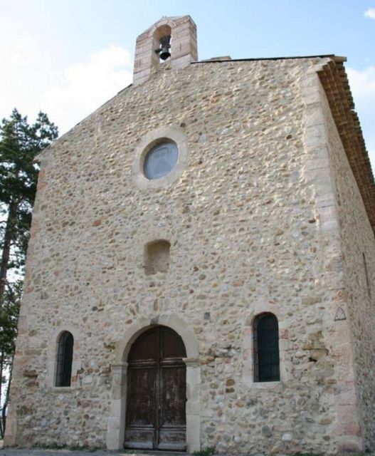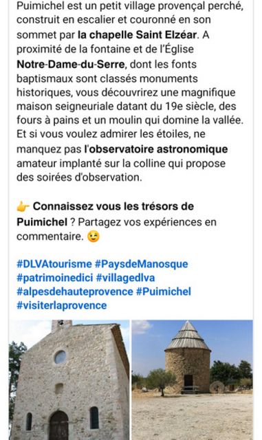 " ... Puimichel s’enorgueillit d’avoir vu naître la bienheureuse Delphine, considérée comme sainte en Provence. Delphine de Signes de Puimichel est née en 1284 et décédée en 1360 après avoir vécu chastement avec saint Elzéar de Sabran. Les époux partagèrent leur vie entre les châteaux de Puimichel et d’Ansouis. Dominant le village une colline où s’élevait autrefois le château ne recèle plus qu’une chapelle dédiée à saint Elzéar. R. Collier la date de la fin du XVII °. Elle est rectangulaire et composée de deux travées que sépare un grand doubleau brisé avec pilastres à impostes. Sans doute était-elle jadis voûtée d’arêtes . L’enquête sur les lieux de culte de 1899 révèle : messe pour St Elzéar, Ste Delphine, à la Nativité de Marie... " A ce jour chapelle désacralisée ,